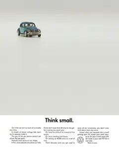 In post-war America, big cars symbolized success. Doyle Dane Bernbach’s ad for the Beetle countered with self-deprecating humor: “Think Small.”