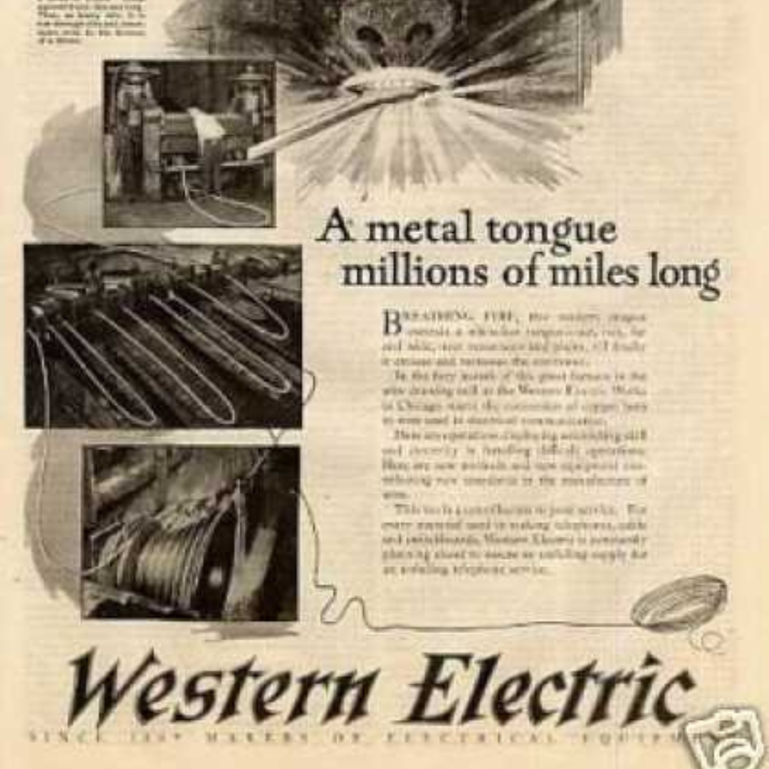 This vintage Western Electric advertisement highlights the company’s role in producing long-distance communication cables, described metaphorically as a “metal tongue millions of miles long.” The visuals show the manufacturing process, from coiling to installation, emphasizing engineering craftsmanship and technological innovation.