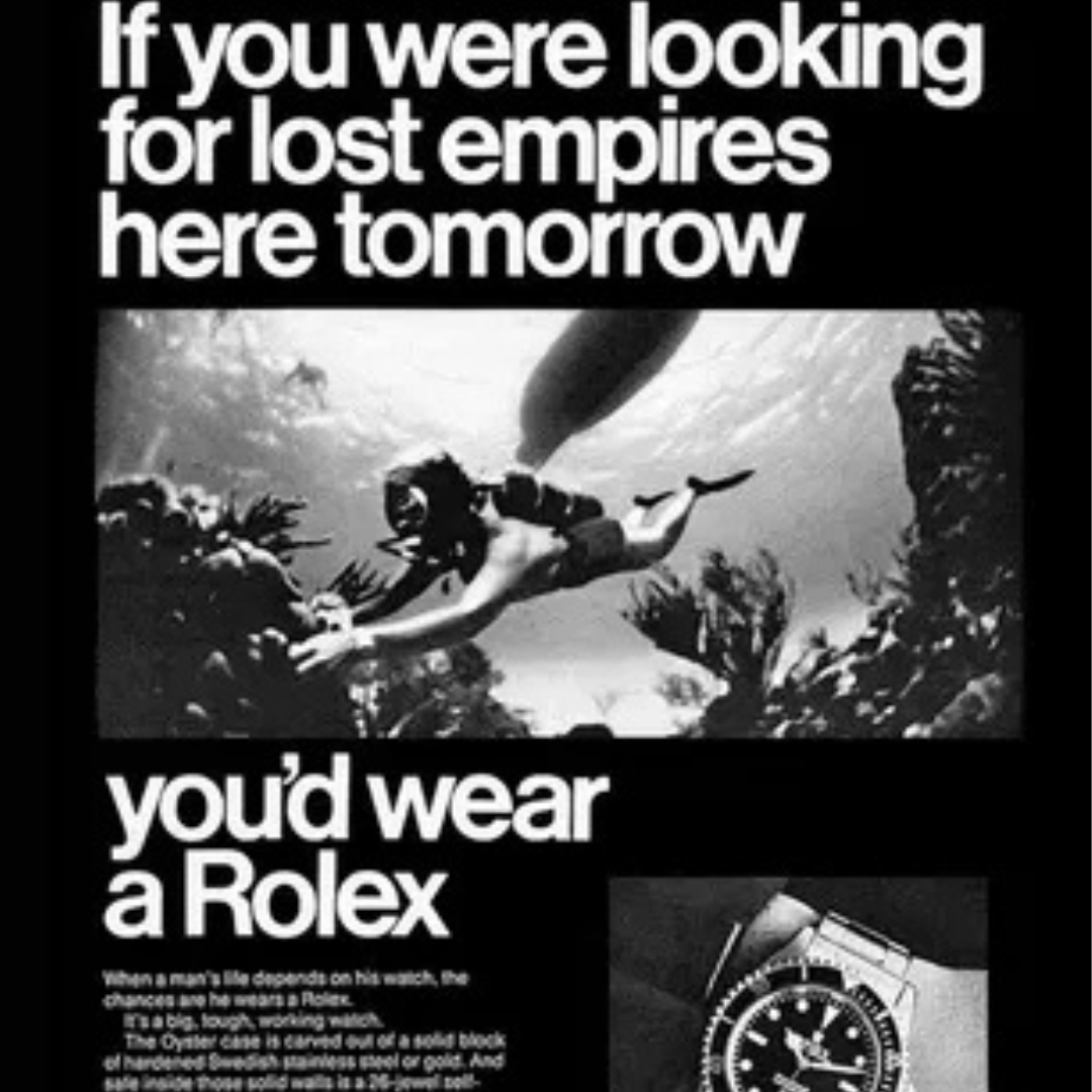 This ad shows someone deep-sea diving, the kind of place where your watch isn’t an accessory, it’s survival gear. Rolex positions itself not as jewelry, but as the tool you’d trust when exploring underwater ruins or chasing lost empires.