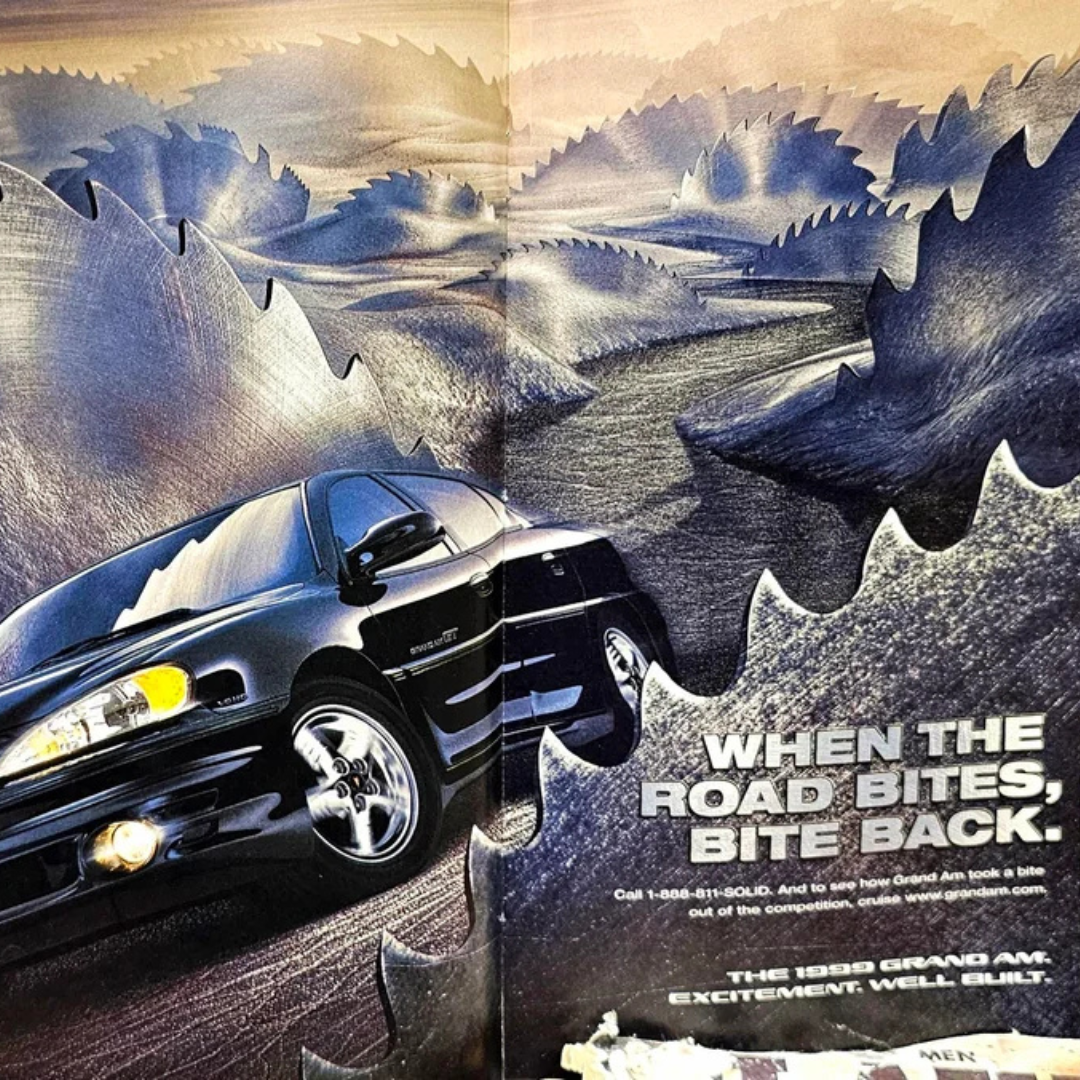 This ad for the 1999 Pontiac Grand Am uses a dramatic visual of a winding road made of sharp saw blades to communicate the idea that driving can be rough, unpredictable, and even hostile. But the Grand Am is shown cutting through the danger with confidence, reinforcing its message of durability, excitement, and solid build quality.