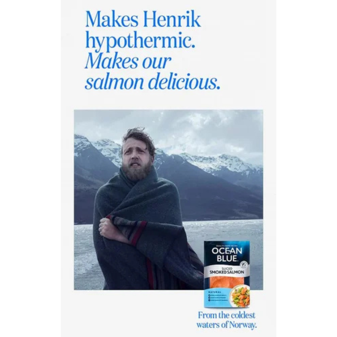 This ad delivers a punchline before you even fully process the picture. There’s Henrik, wrapped in a blanket, shivering like he’s just escaped the Arctic alive. Behind him sits a landscape so cold it practically bites. And then the line hits: “Makes Henrik hypothermic. Makes our salmon delicious.” Suddenly, the whole scene makes sense. It’s absurd, it’s darkly funny, and it instantly tells you one thing, this salmon comes from waters so cold, they practically bully the fishermen. The joke lands because the contrast is so sharp: Henrik suffers so you don’t have to.