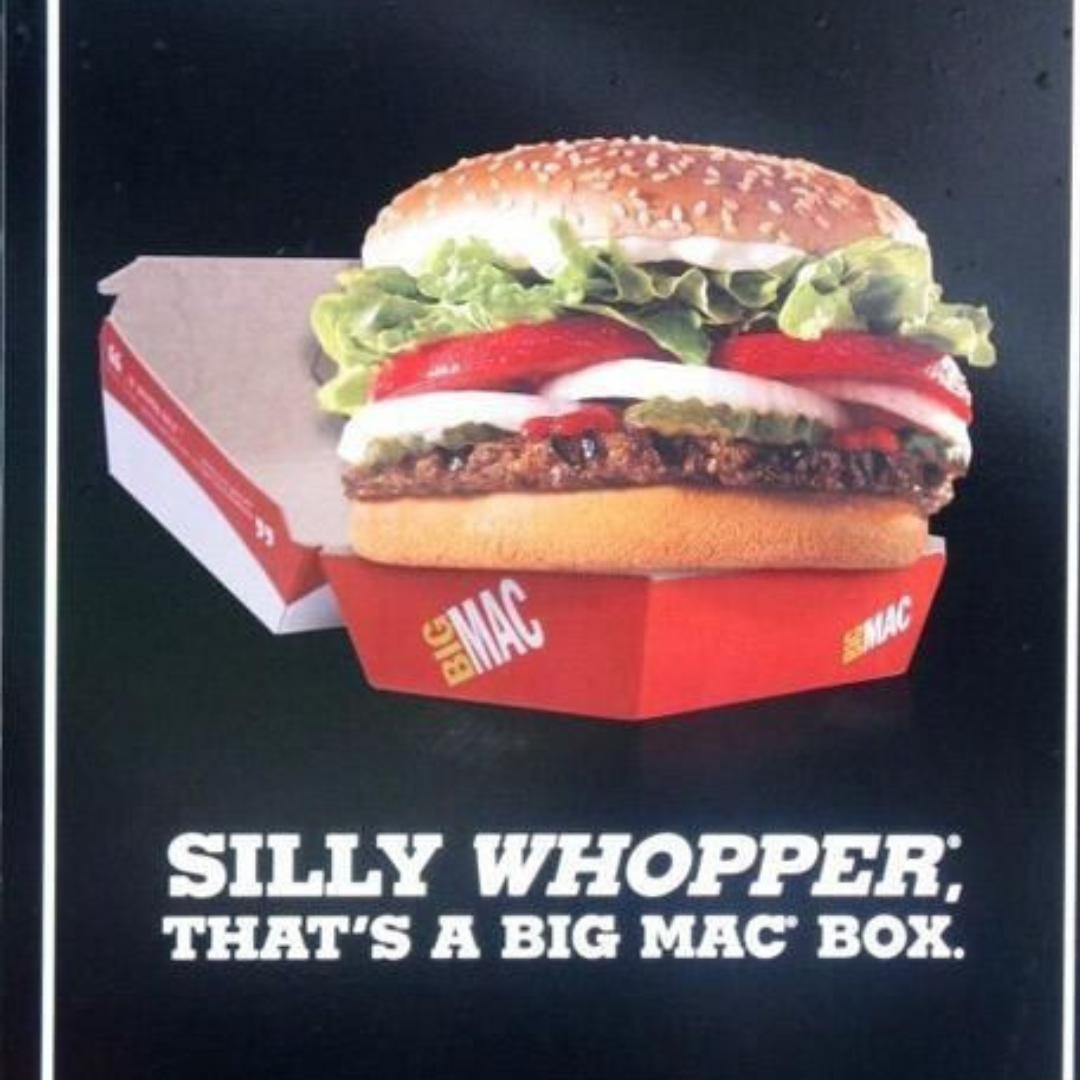 This ad is pure petty. McDonald’s basically grabs a Burger King Whopper, stuffs it into a Big Mac box, and laughs. It’s the kind of disrespect that feels like a schoolyard joke — simple, childish, and devastating. The message is loud: even your burger knows where the real fame is.