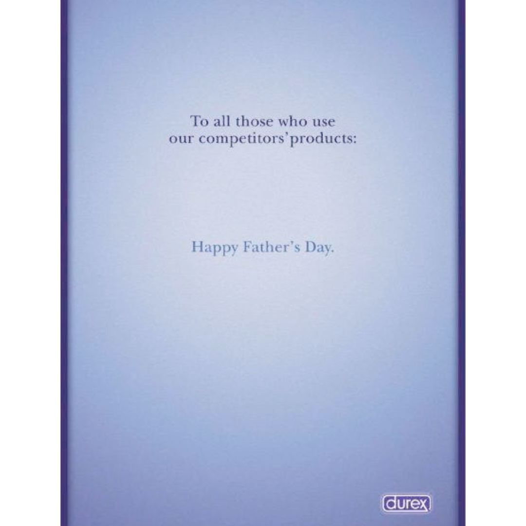 This ad says almost nothing, and that’s exactly why it works. It’s bold without being loud, cheeky without being crude. One line, one pause, one quiet punchline. Durex doesn’t congratulate fathers directly. Instead, it speaks to the alternative reality, and lets your brain finish the joke.