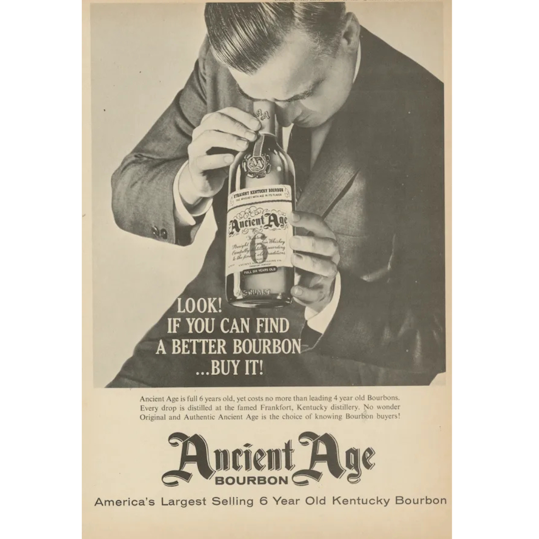 This Ancient Age Bourbon ad looks bold on the surface, a man examining the bottle like it’s a rare artifact, paired with a headline that dares you to do the unthinkable: buy something else if it’s better. It’s confident, almost cocky, but in that charming, old-school way that makes you lean in instead of roll your eyes.