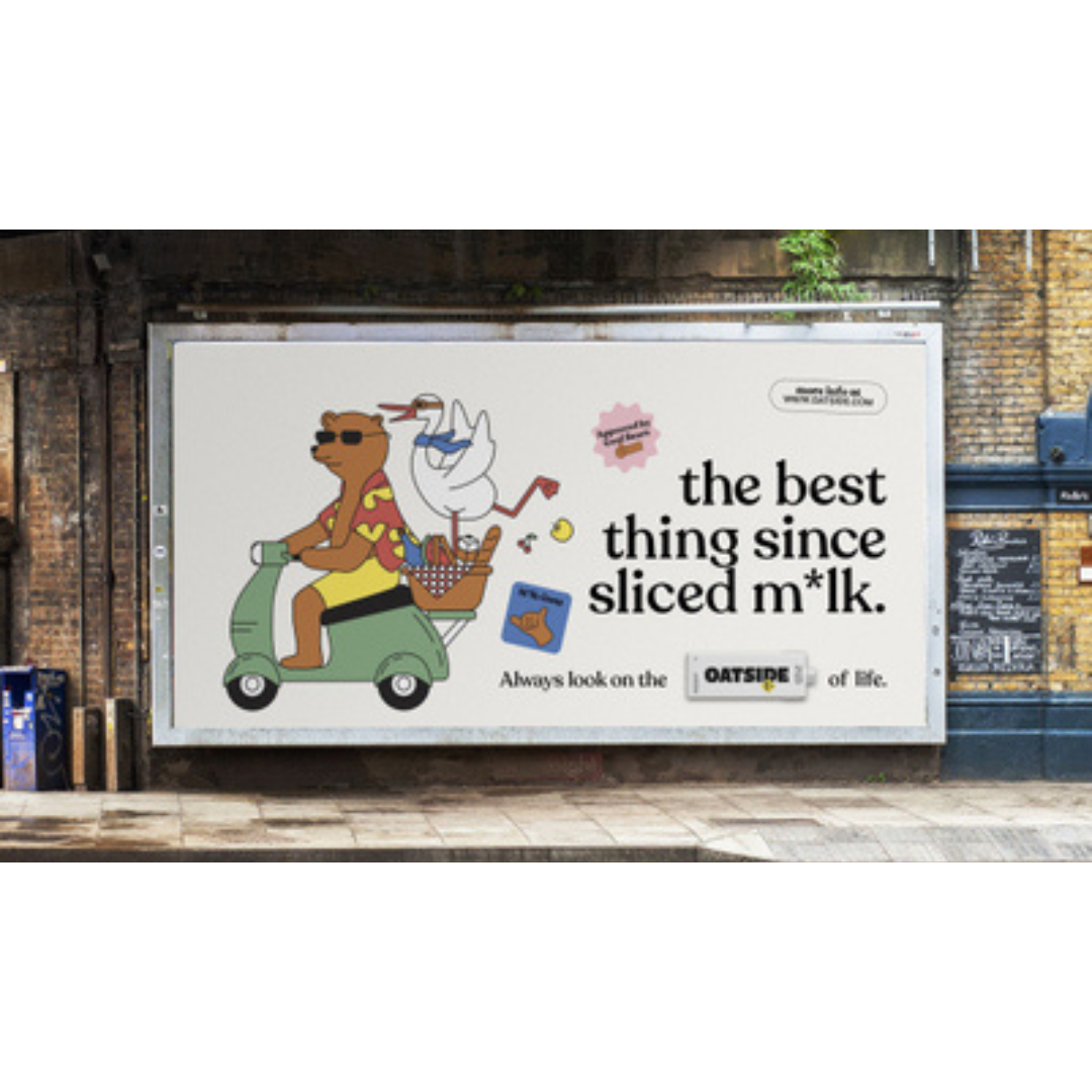 This Oatside ad feels like a little animated daydream that escaped from someone’s notebook. You’ve got a chill bear in shades riding a scooter, a duck hanging on like it’s late for brunch, and a carton of oat milk sitting proudly beside the headline: “the best thing since sliced milk.”