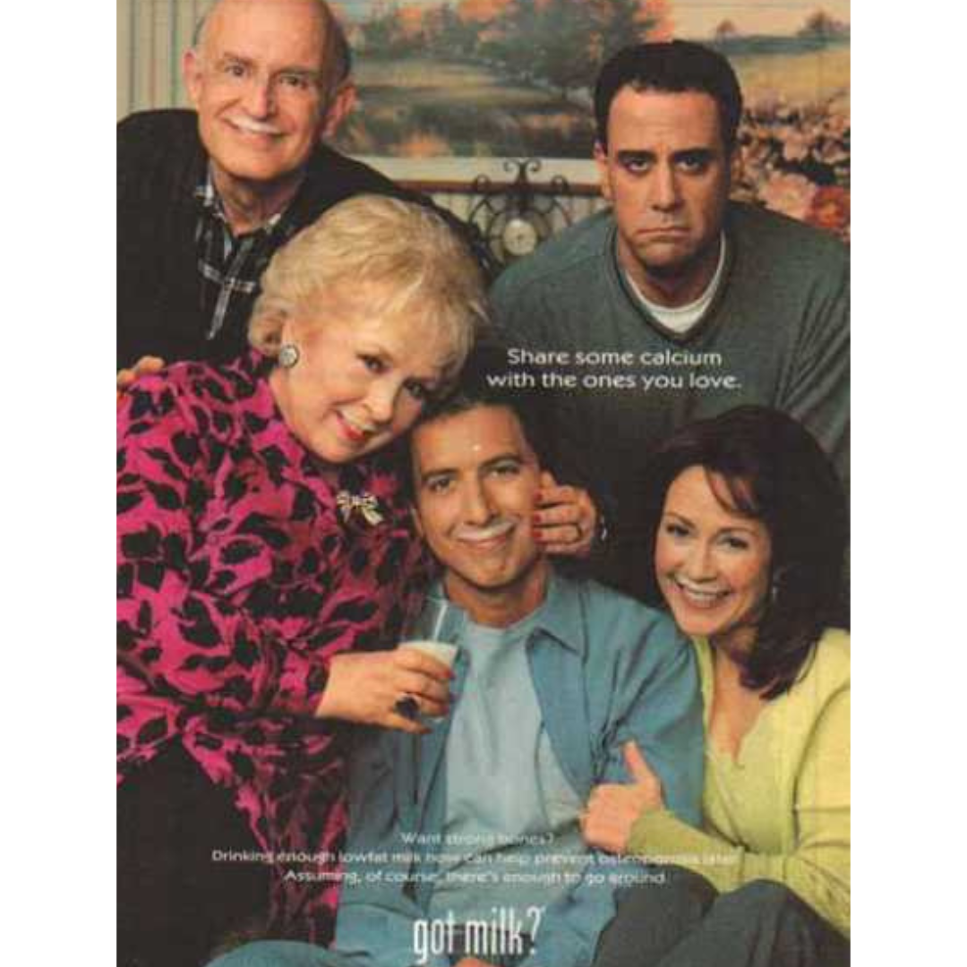 This “Got Milk?” ad leans into classic family chaos, the overly affectionate mom, the smiling relatives, and that one exhausted guy who’s clearly had enough. Everyone is clinging to him like a prized heirloom, and he’s just sitting there gripping a glass of milk like it’s his emotional support beverage.