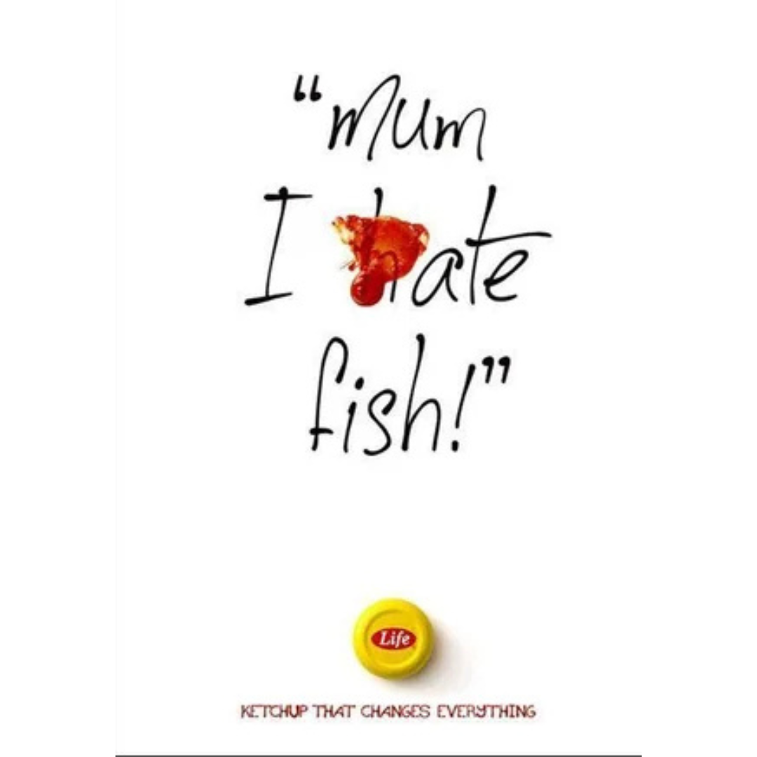 Life ketchup isn’t positioned as a condiment here. It’s positioned as a bridge. The reason something unwanted suddenly becomes acceptable. Even enjoyable. By placing the ketchup stain right inside the sentence, the ad visually interrupts the story in the same way the product interrupts reality. Fish didn’t change. The person didn’t change. What changed was the experience. There’s no persuasion happening out loud. The reader connects the dots themselves, and that’s why it sticks.
