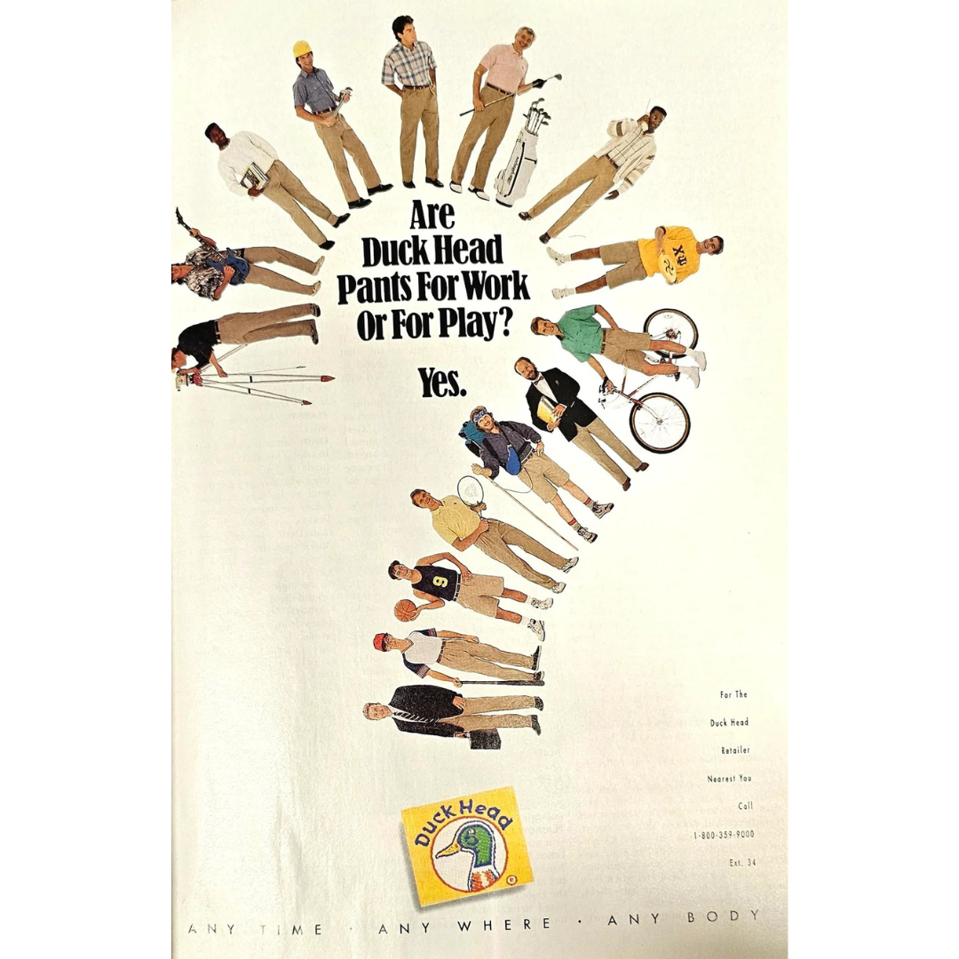 This Duck Head ad is basically a roll call of every guy you’ve ever met, office workers, golfers, cyclists, skiers, students, dads, the weekend warrior, the Monday-morning commuter, lined up in one big looping parade. And they’re all wearing the same pants. It’s almost funny how effortlessly each one fits into his own world without changing a thing except the activity. The ad answers the classic question, “Work or play?” with the most confident, borderline sassy answer possible: yes.