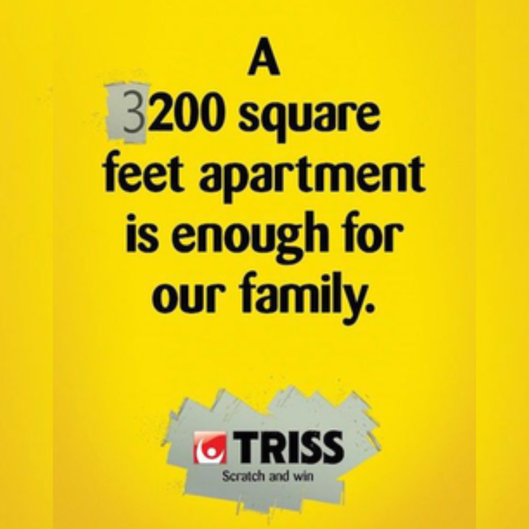 This advertisement from Triss, a lottery scratch card brand, uses a clever and humorous visual twist to grab attention. At first glance, it reads: “A 3200 square feet apartment is enough for our family.” However, upon closer inspection, it becomes clear that the number “3” is scratched off, revealing the original message was likely just “200 square feet.”