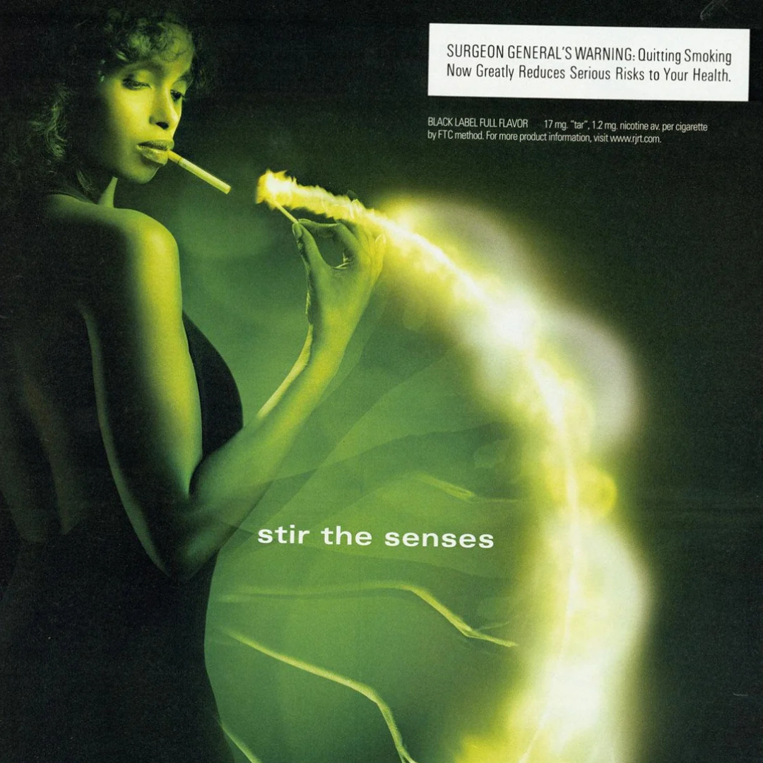 This ad uses sensory association, it visually represents smoke as something hypnotic, elegant, and alluring. Rather than focusing on the product itself, it focuses on the mood and feeling associated with using it. The surreal lighting, color palette, and stylized smoke create an emotional narrative: cigarettes as a sensory, transformative experience.