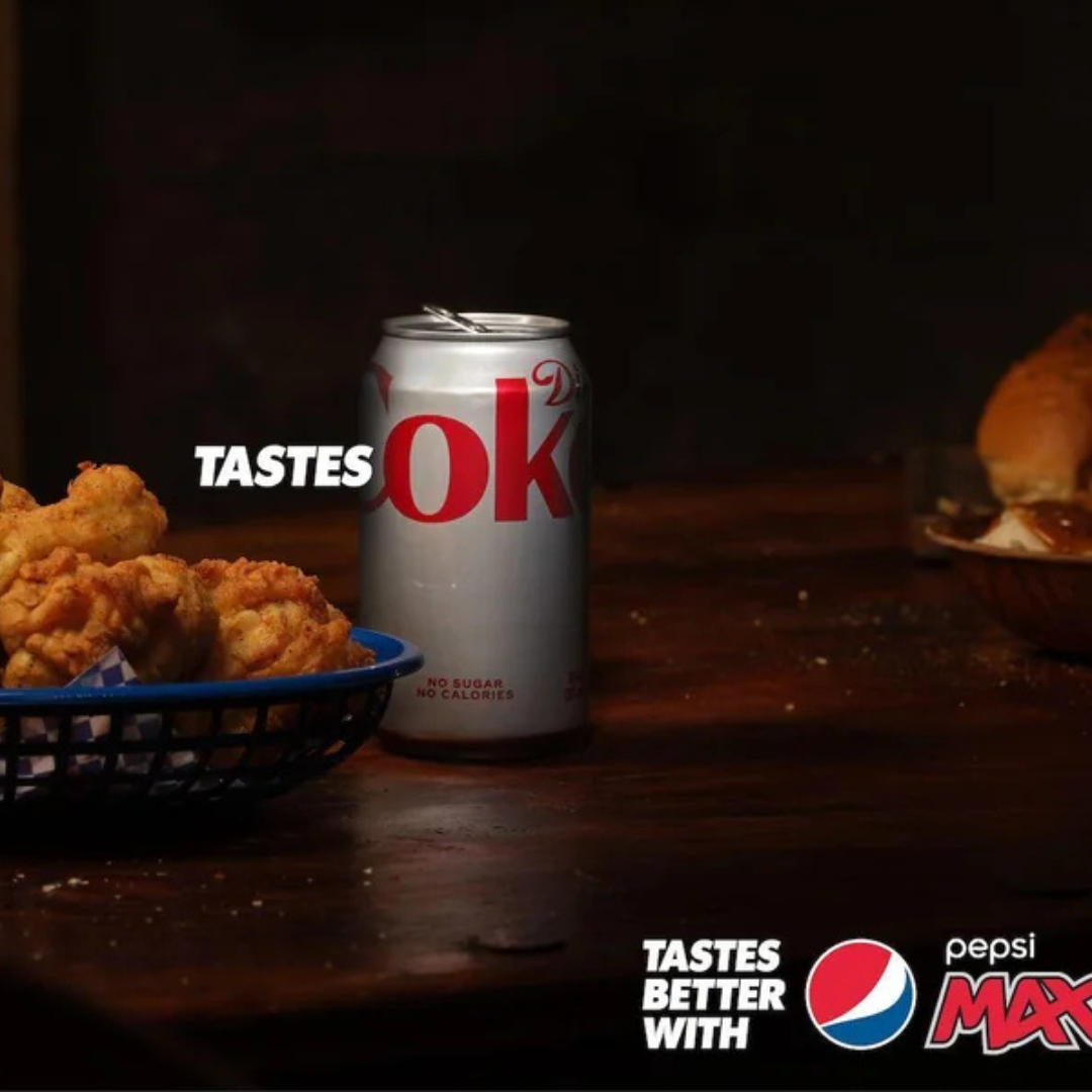 This ad humorously shows a can of Diet Coke next to fried chicken, with the word “TASTES” placed so the viewer’s brain wants to complete it as “Tastes like Coke.” But the twist comes from the bold message in the corner: “TASTES BETTER WITH Pepsi Max.”