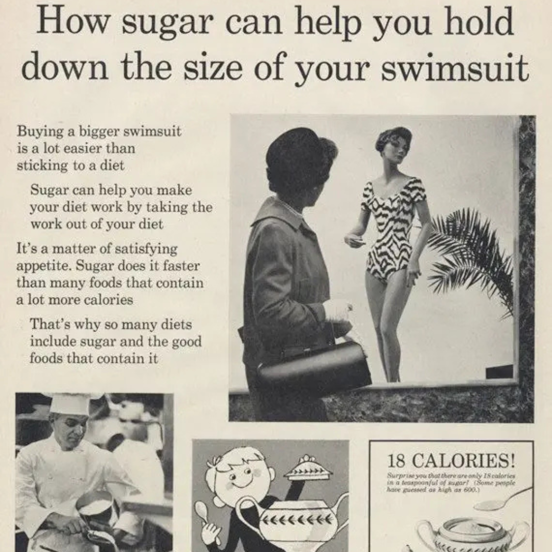 This vintage sugar ad claims sugar can “help you hold down the size of your swimsuit,” pitching it as an appetite-helper instead of the thing that causes appetite. It’s backwards logic sold with confidence, and somehow it worked at the time.