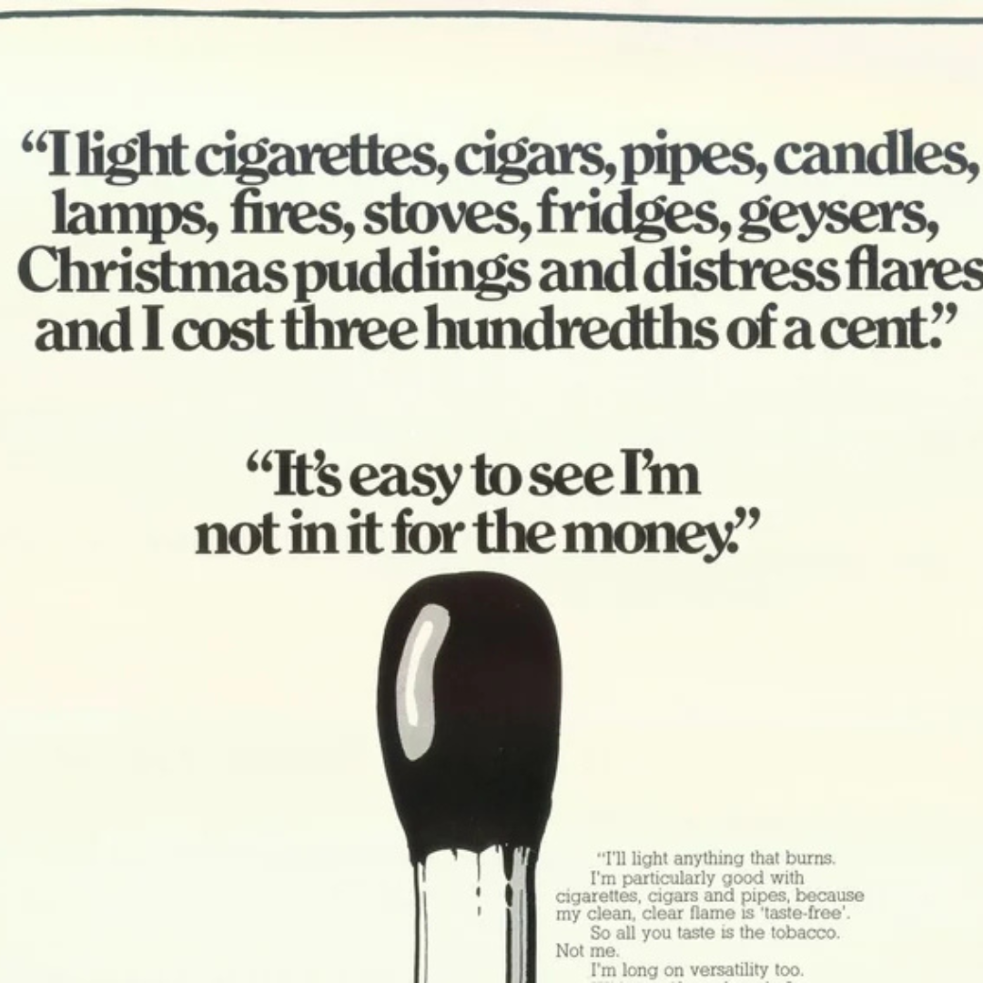 This ad does something clever, it gives a matchstick a voice. Not a dramatic one, not a heroic one, just a tired, slightly sarcastic worker who’s listing everything it does for basically no money. It’s funny because it’s true: a match has one job, does it perfectly, costs almost nothing, and still doesn’t complain. That simplicity is what makes the ad charming, it makes you care about something you usually never think about twice.