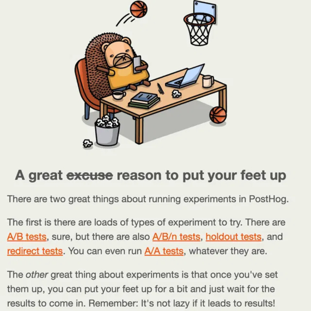 This ad is effortlessly chaotic — a hedgehog slumped in a chair, snacks everywhere, taking jump shots instead of meetings. And that’s exactly the point: PostHog makes experiments so automated you basically become furniture with Wi-Fi.