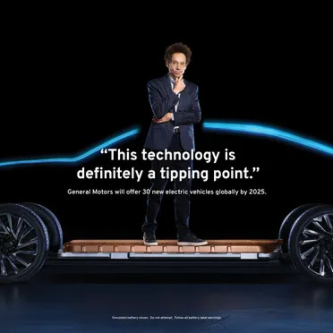 This GM ad features Malcolm Gladwell standing on top of an EV chassis silhouette while delivering the line: “This technology is definitely a tipping point.” The message promotes GM’s commitment to releasing 30 new electric vehicles globally by 2025.
