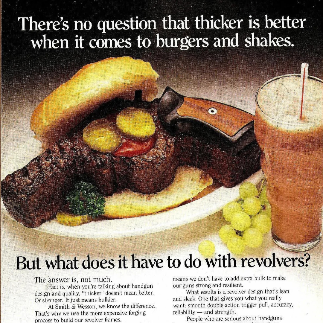 This ad uses a humorous comparison between burgers, shakes, and a revolver grip to make a point: thickness works great for food, but when it comes to handgun design, bulk doesn’t equal better performance. Smith & Wesson emphasizes that their revolvers are crafted using a more advanced forging process that keeps them strong, sleek, and reliable without unnecessary weight.