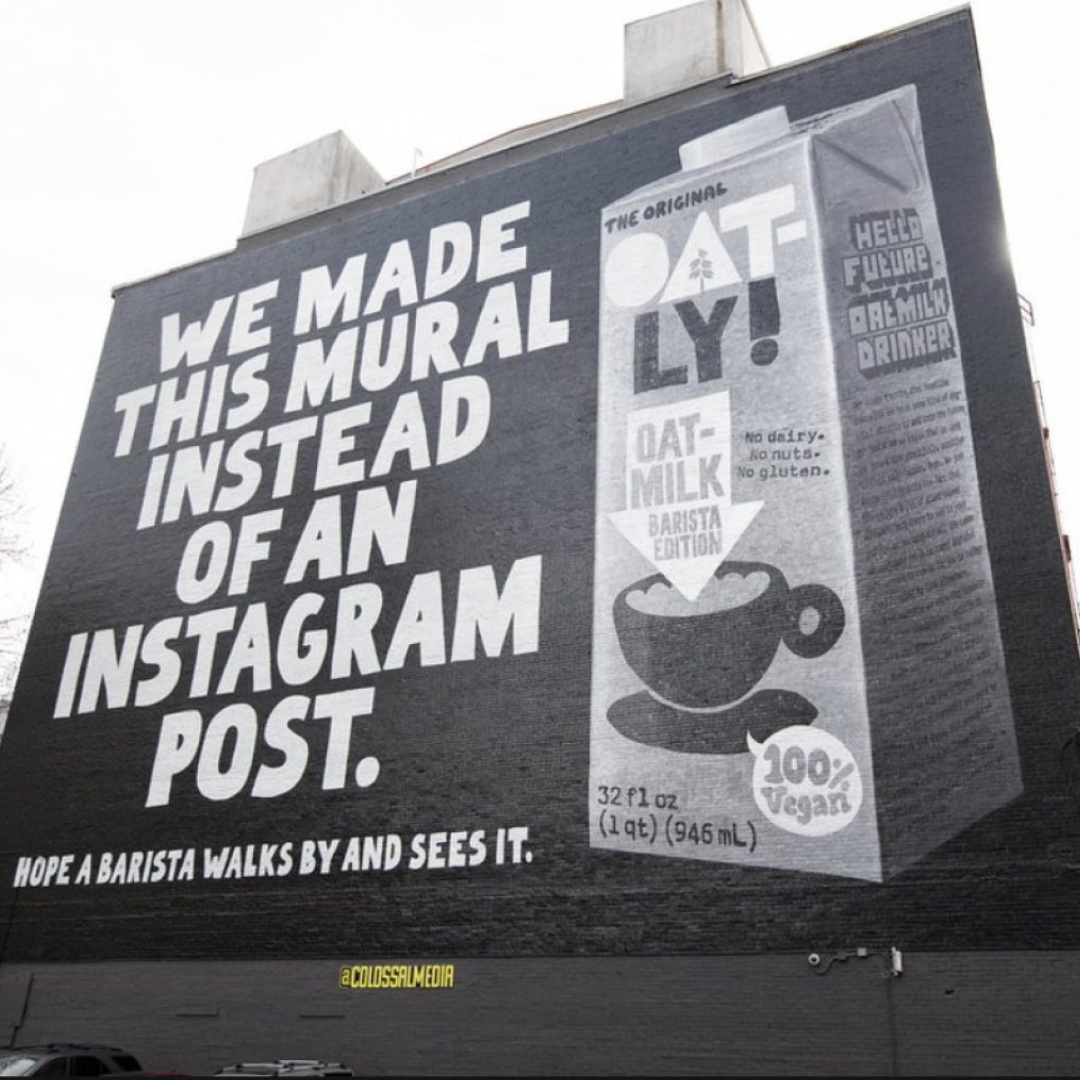 Oatly basically said, “Why chase likes when we can take over an entire building?” Instead of crafting some perfectly polished Instagram post, they slapped a giant, screaming mural on a city wall. The message is loud, cheeky, and wonderfully unnecessary, an oat milk carton towering over the street with a tagline that winks at baristas, coffee lovers, and anyone who’s ever scrolled mindlessly on their phone.
