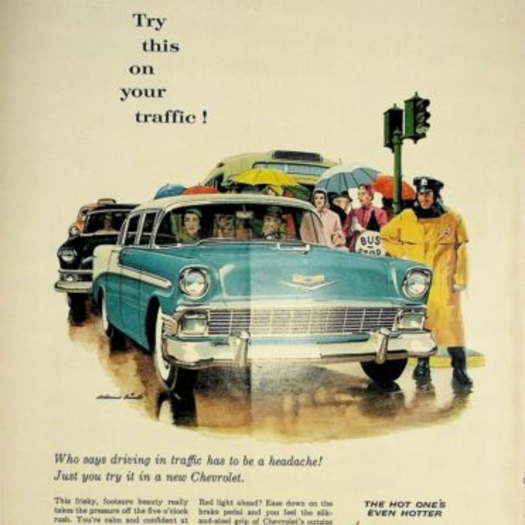 This vintage Chevrolet ad humorously suggests that driving doesn’t have to be stressful, even in heavy traffic. The illustration shows a packed road with frustrated passengers and a traffic officer, but the bright, confident Chevrolet front and center represents ease, comfort, and calm despite the chaos around it.