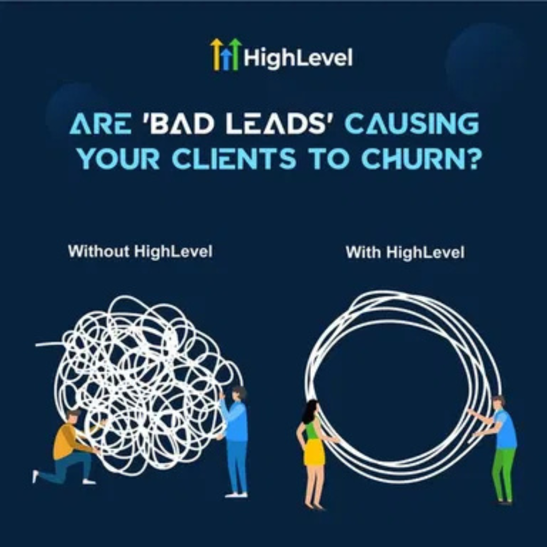 The ad contrasts two visuals: a chaotic ball of tangled lines labeled “Without HighLevel” and a smooth, organized circle labeled “With HighLevel.” It highlights how HighLevel helps agencies reduce client churn by fixing the problem of bad or unqualified leads.