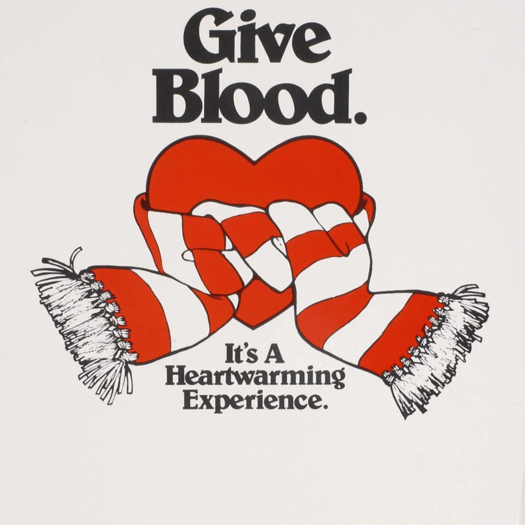 This vintage American Red Cross ad features a bold red heart wrapped in a cozy red-and-white striped scarf, accompanied by the message “Give Blood. It’s a Heartwarming Experience.” The visual metaphor suggests that donating blood is not only life-saving but emotionally uplifting.