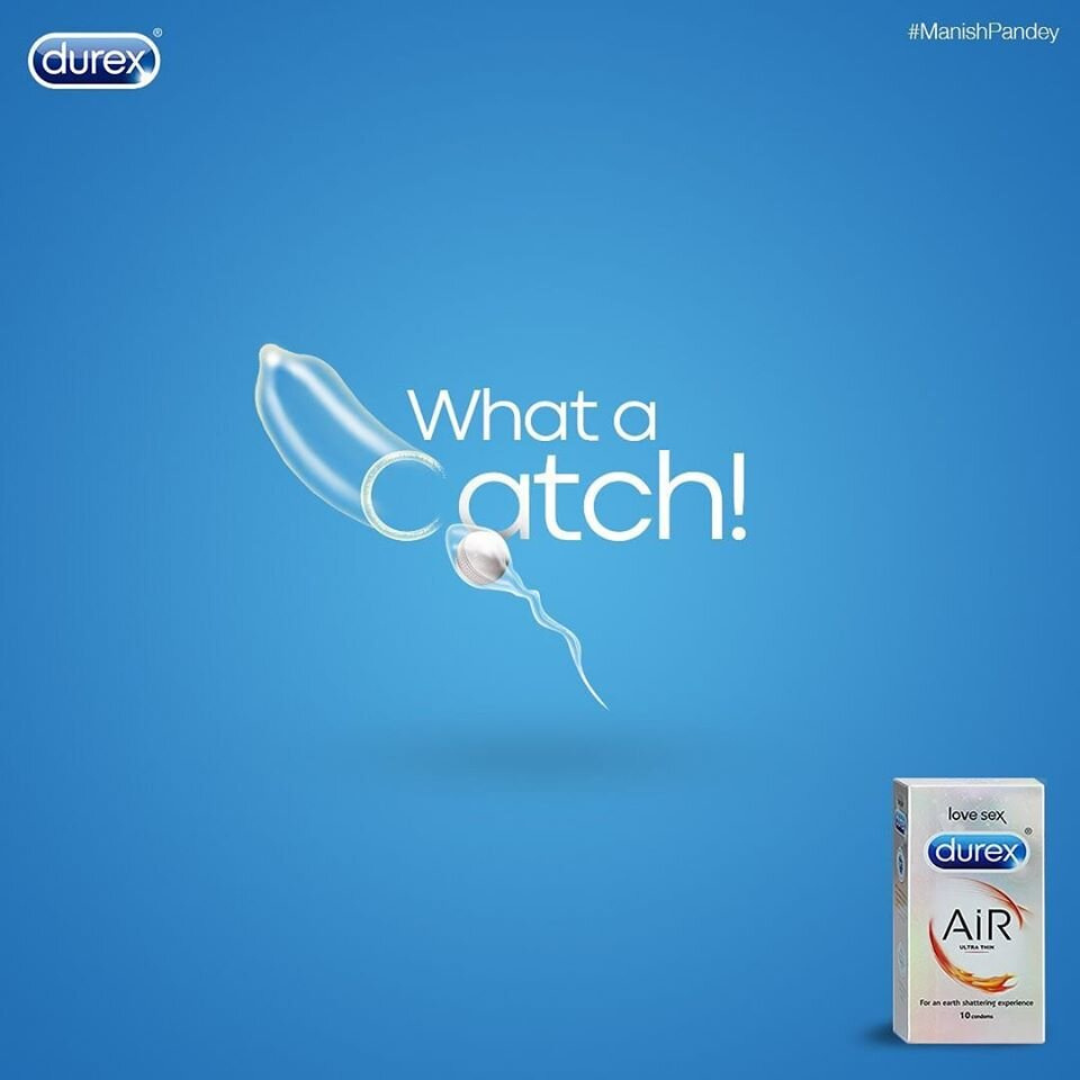 This Durex ad uses a playful visual: a condom catching a sperm like a baseball, paired with the tagline “What a Catch!” It instantly communicates what the product does, preventing unwanted pregnancy, without a single explicit sentence.