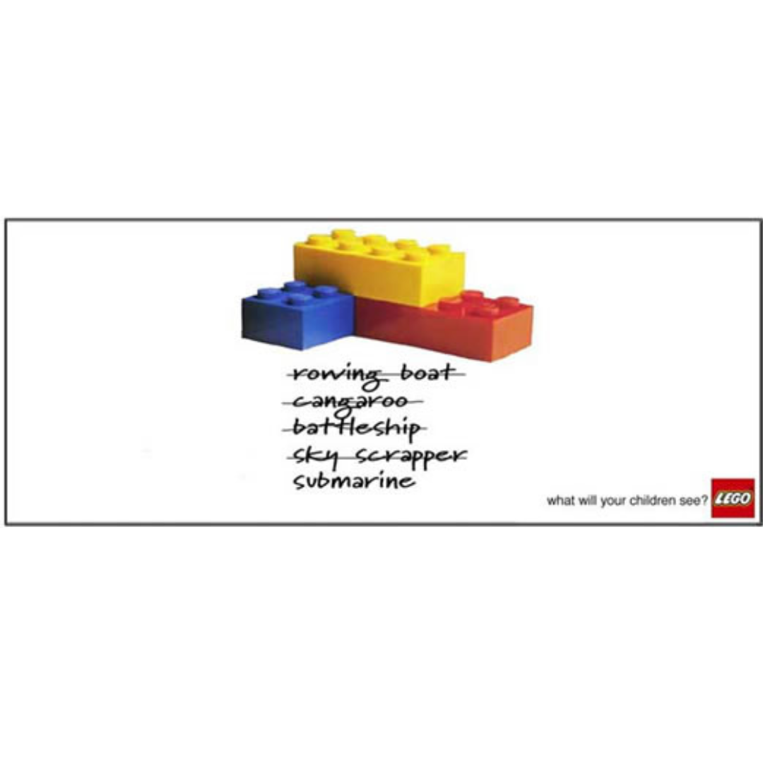 This ad isn’t really about toys, it’s about imagination. On the surface, you’re looking at a few simple LEGO bricks. But the crossed-out words underneath tell a much bigger story. What adults see as plastic blocks, children see as boats, animals, cities, and entire worlds. The ad gently reminds you that creativity doesn’t come pre-packaged, it comes from perspective.