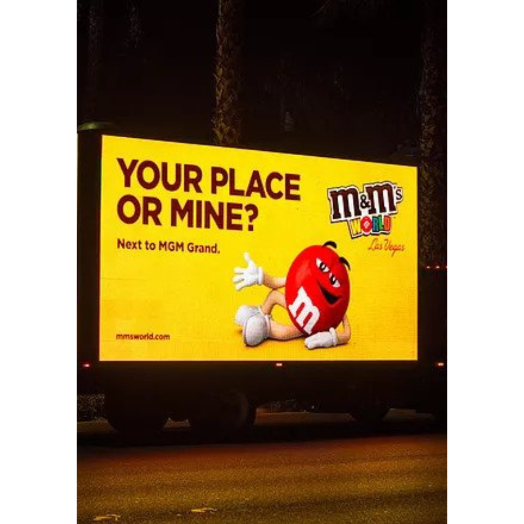 The genius is in how little it says. One short question. One familiar character. One clear location cue. The red M&M is relaxed, almost lounging, which lowers your guard instantly. There’s no push, no urgency, just an invitation wrapped in humor. By tying the message to a real place, the ad collapses distance. You don’t need directions. You don’t need convincing. You just think, yeah… that’s actually close.