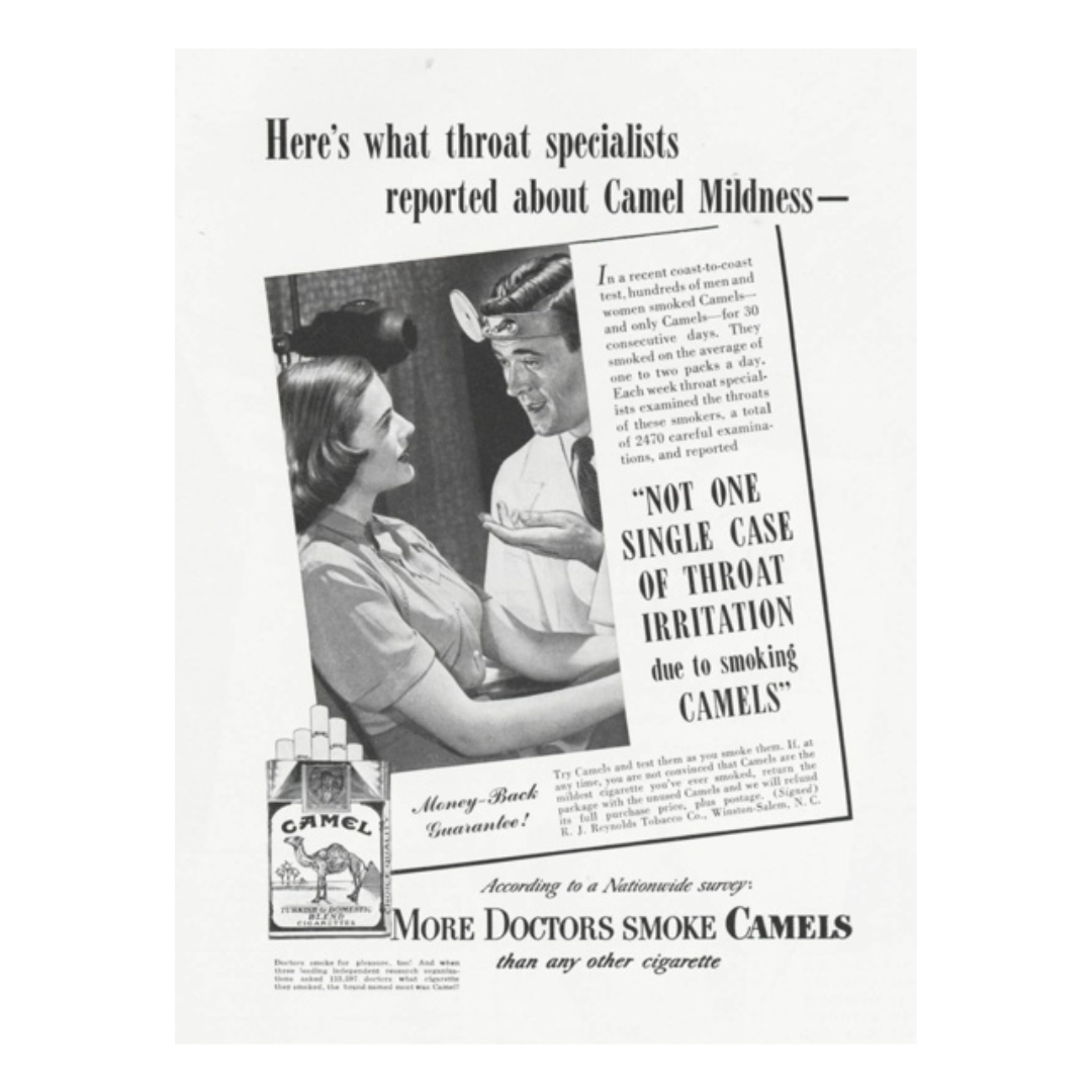 This ad doubles down on reassurance. Instead of asking the audience to trust the brand, it asks them to trust specialists, throat doctors, examinations, tests, reports. The headline positions the message as a medical finding, not a marketing claim. Camel isn’t trying to feel cool or exciting here. It’s trying to feel safe, approved, and considered.