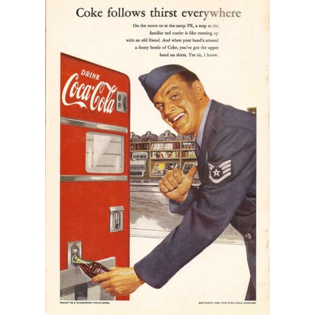 This vintage Coke ad feels like a postcard from an era when vending machines were magical and a cold Coca-Cola was the closest thing to a universal comfort. The smiling serviceman isn’t just grabbing a drink, he’s reconnecting with something familiar, friendly, and grounding. The line “Coke follows thirst everywhere” frames the brand as reliably present, no matter where life sends you. It positions Coke not as a beverage, but as a companion, the thing that makes any place feel a little more like home.